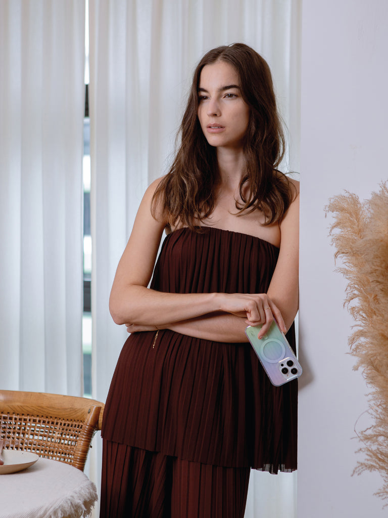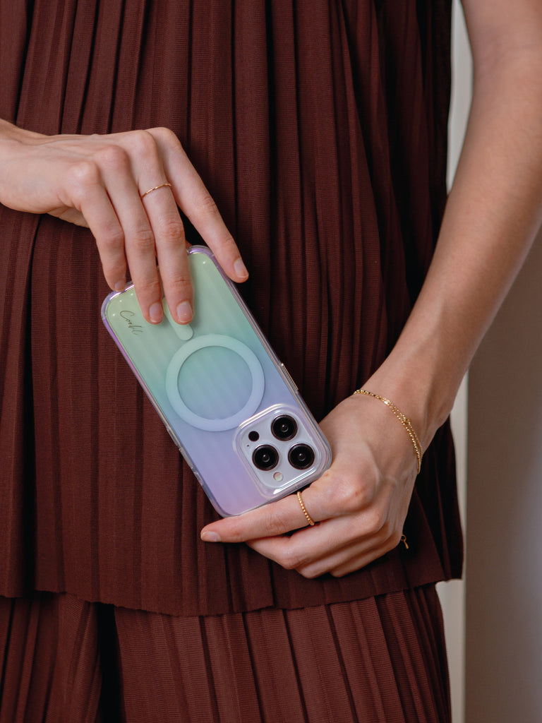 A sky at dusk tinted with pastel shades. Sleek lines dash across the coloured spectrum for a more refined look. Here’s a scene of the sunset you can pocket, rendered with a layer of extra shine.