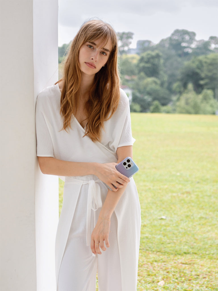 A sky at dusk tinted with pastel shades. Sleek lines dash across the coloured spectrum for a more refined look. Here’s a scene of the sunset you can pocket, rendered with a pop of holography.