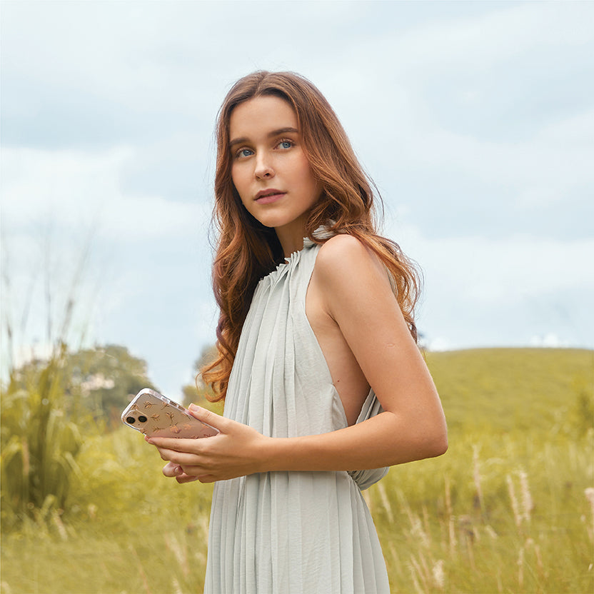 Wild flowers in full bloom, adorned with a touch of gold. Its exquisite floral design is subtly accentuated with two colors, and exudes the softness of delicate spring flowers. Paired with a crystal-clear back for an understated, minimal look.